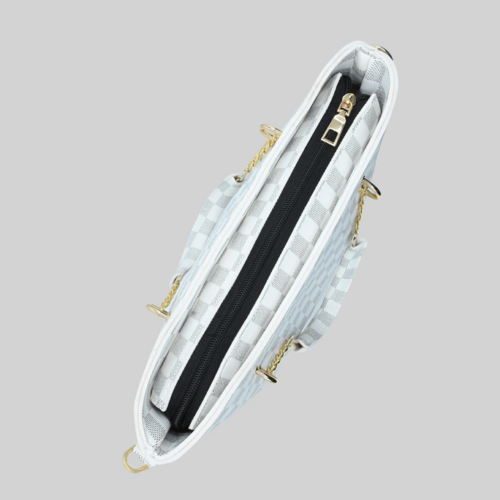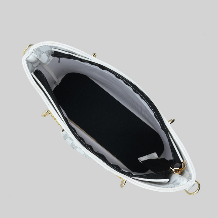 Made from premium PU leather in an elegant white checkered pattern, this tote blends fashion with functionality. The gold chain handles add a touch of luxury, while the spacious interior ensures it’s perfect for work, university, shopping, or daily outings.